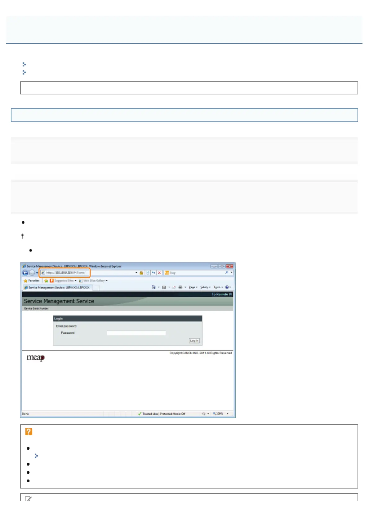 Enter "https://<Printer's IP address>:8443/sms/" in the address bar, and then press [ENTER] from the