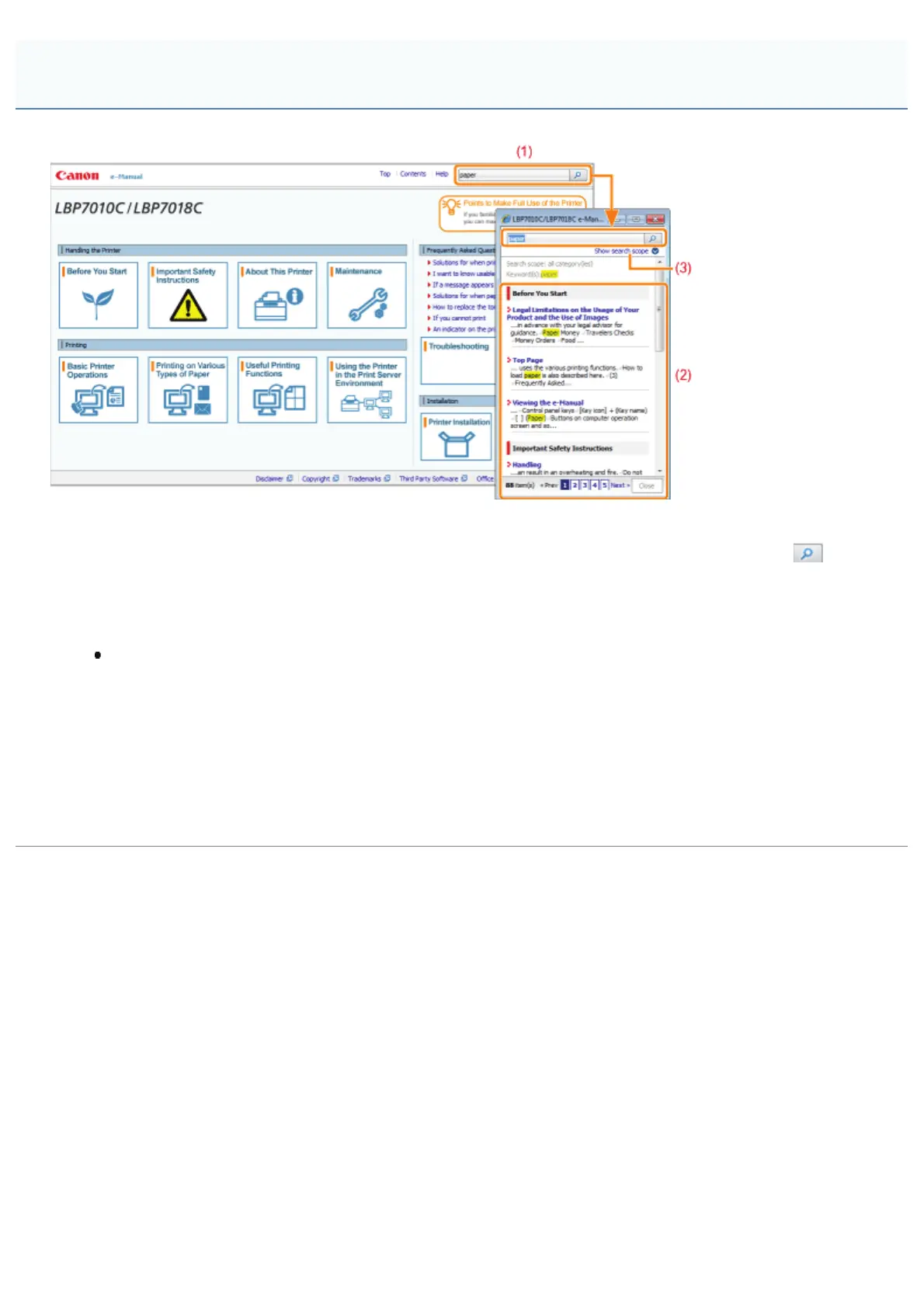 Enter a keyword in the entry field which is located on the upper right of the e-Manual, and then click [