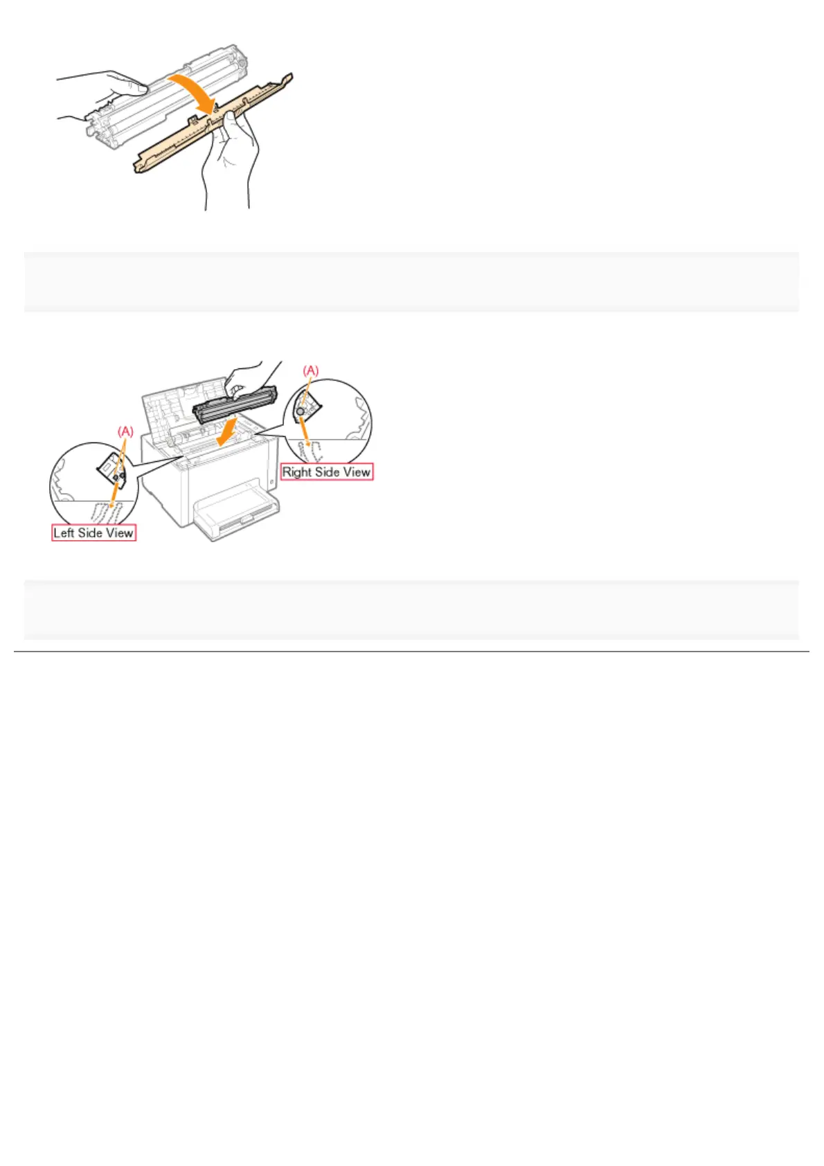 Install the toner cartridges while aligning (A) on both sides of the toner cartridges with the toner cartridge guides inside the