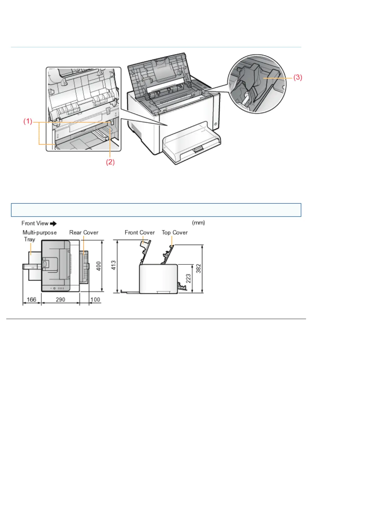(1) Lock Release Levers (2) Drum Cartridge Guide (3) Toner Cartridge Guide