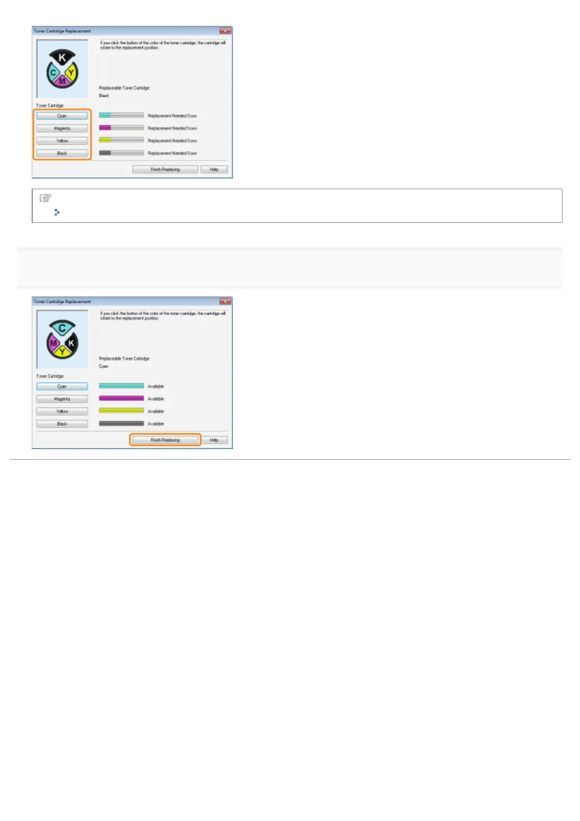 Click [Finish Replacing] after the toner cartridge replacement is complete.