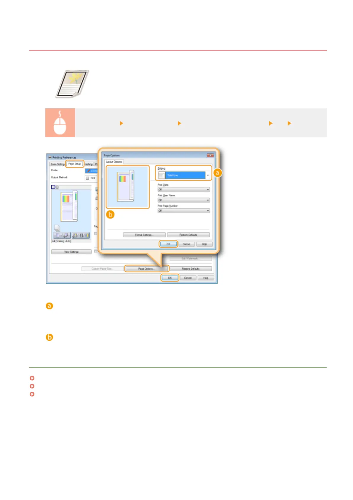 [Page Setup] tab Click [Page Options] Select the border type in [Edging] [OK] [OK]