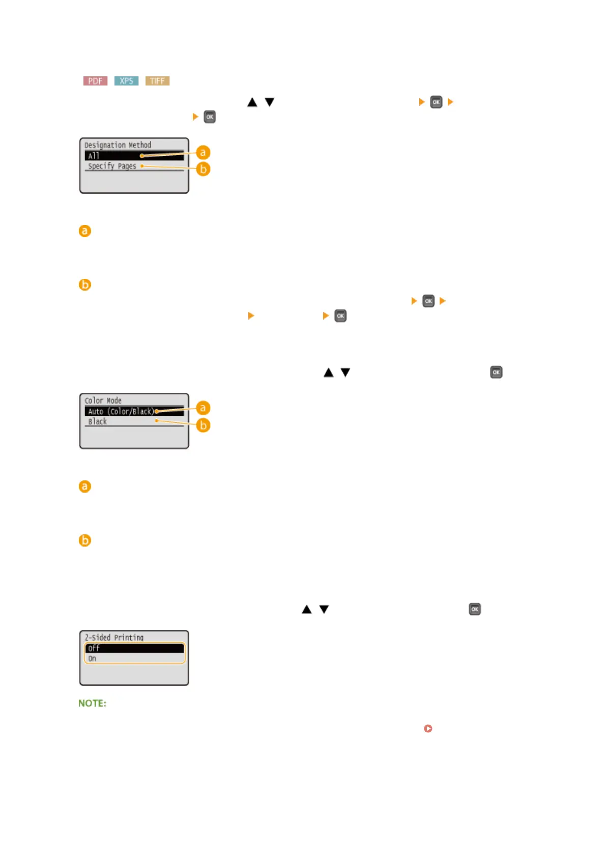 Specify the range (pages) to print. Use / to select <Designation Method> select the method to
