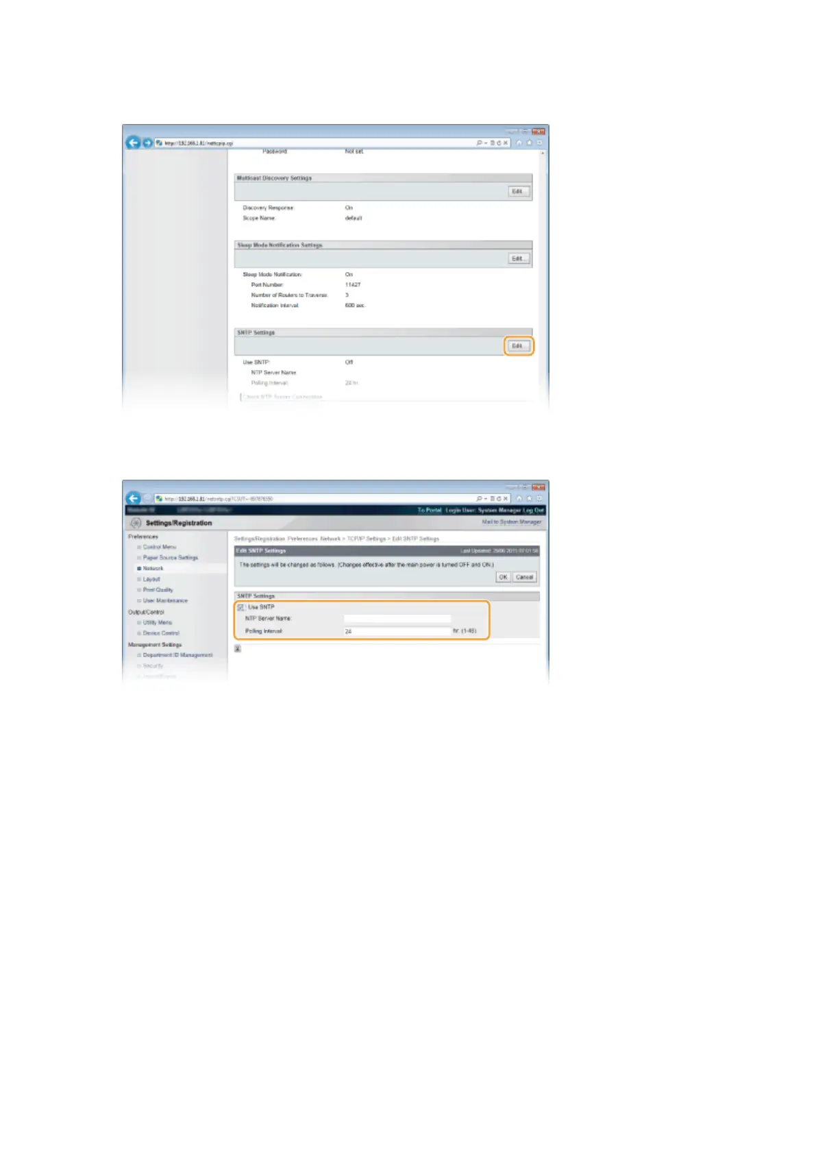 Click [Edit] in [SNTP Settings].