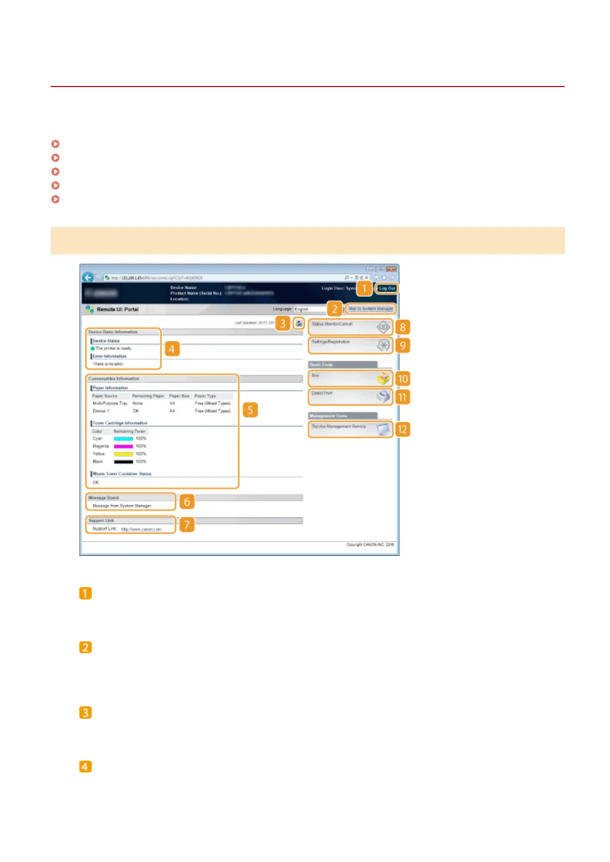 This section describes the typical screens of the Remote UI.