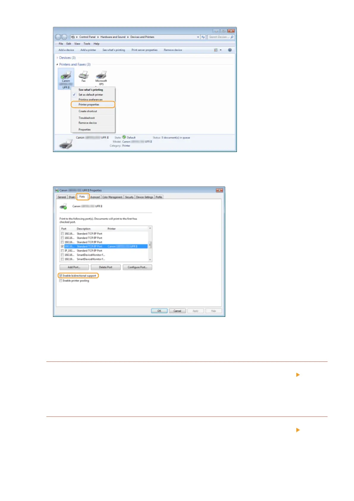 In the [Ports] tab, make sure that the [Enable bidirectional support] check box is