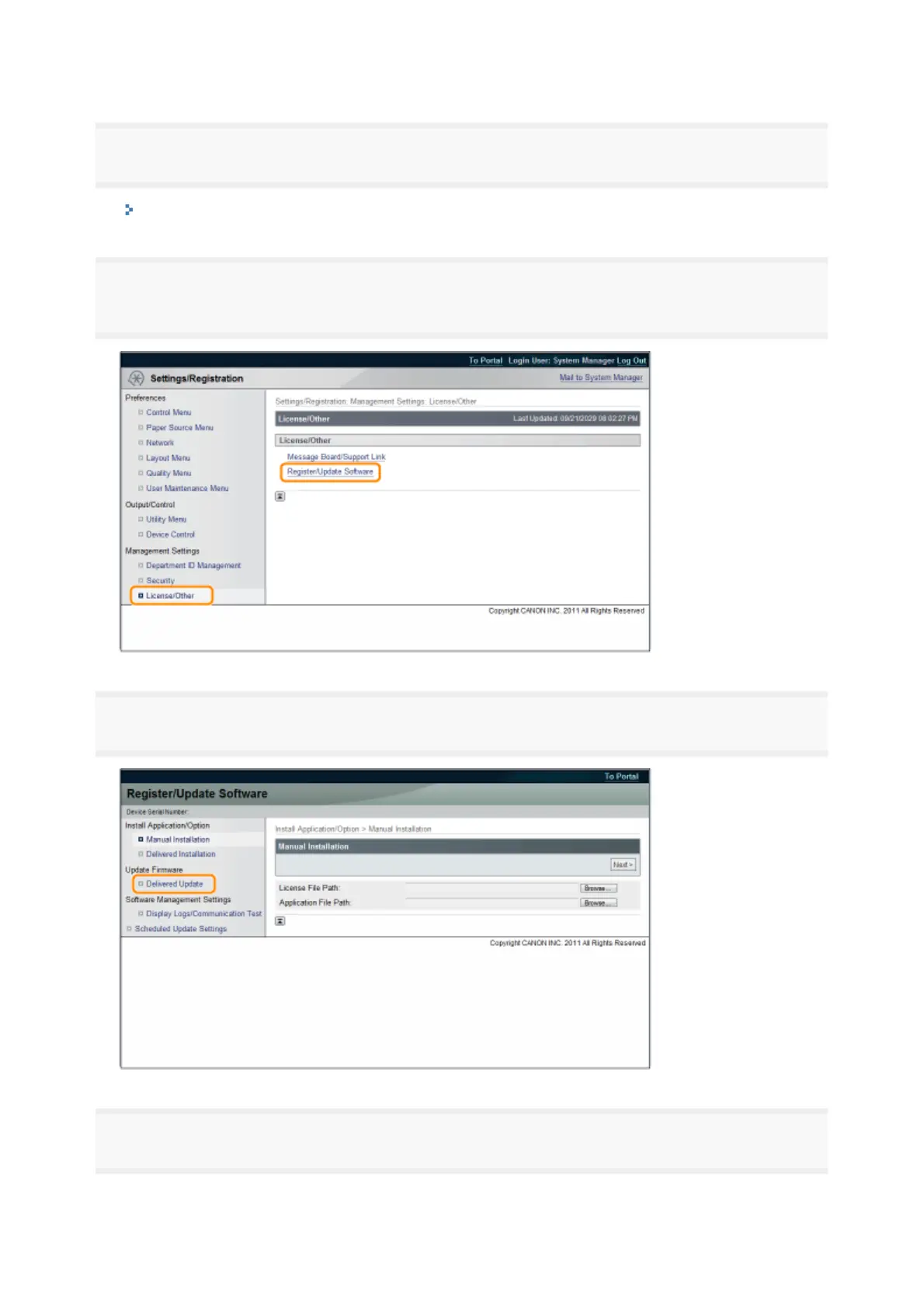From the top page of the Remote UI, click [Settings/Registration] → [License/Other] →