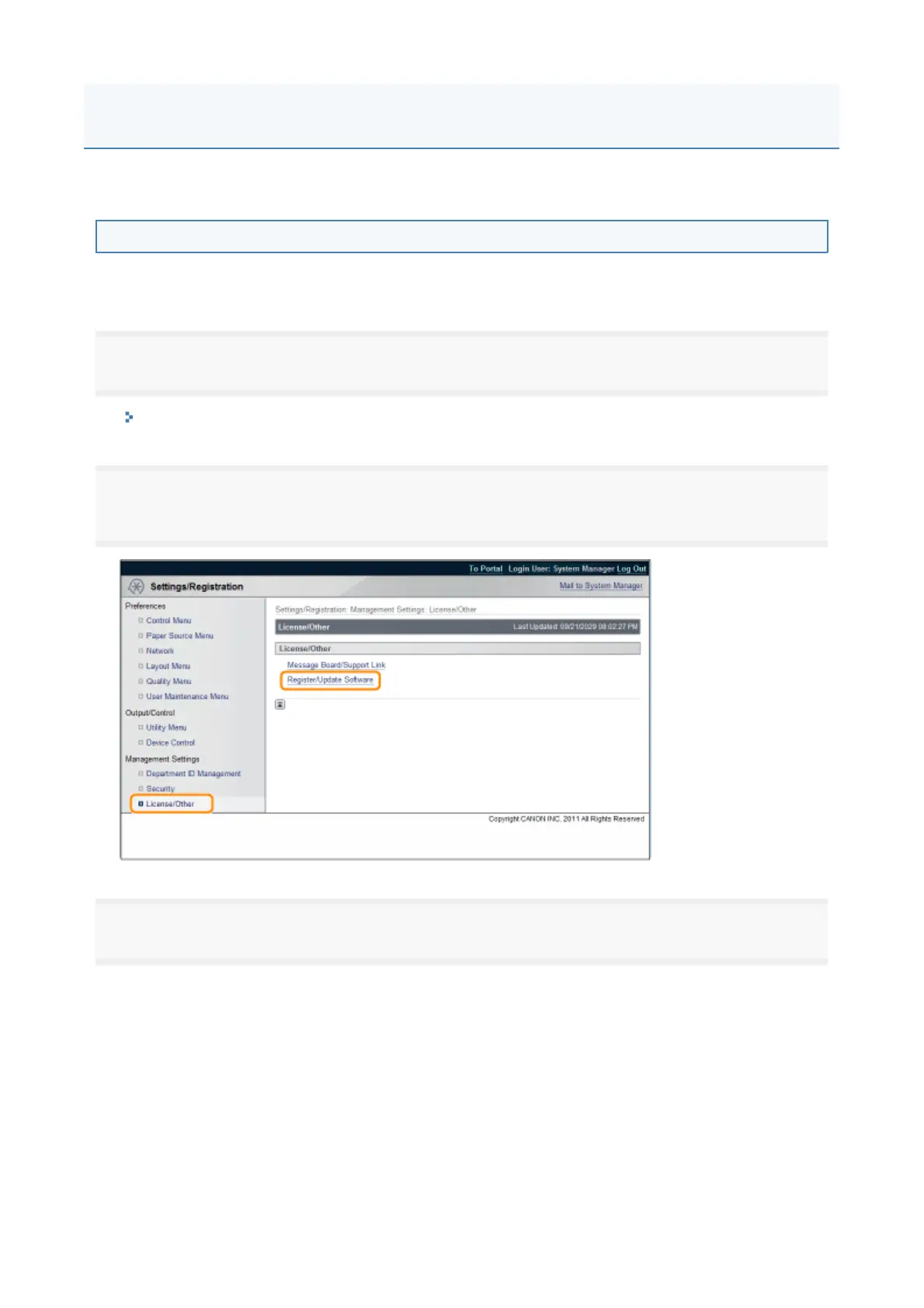 From the top page of the Remote UI, click [Settings/Registration] → [License/Other] →