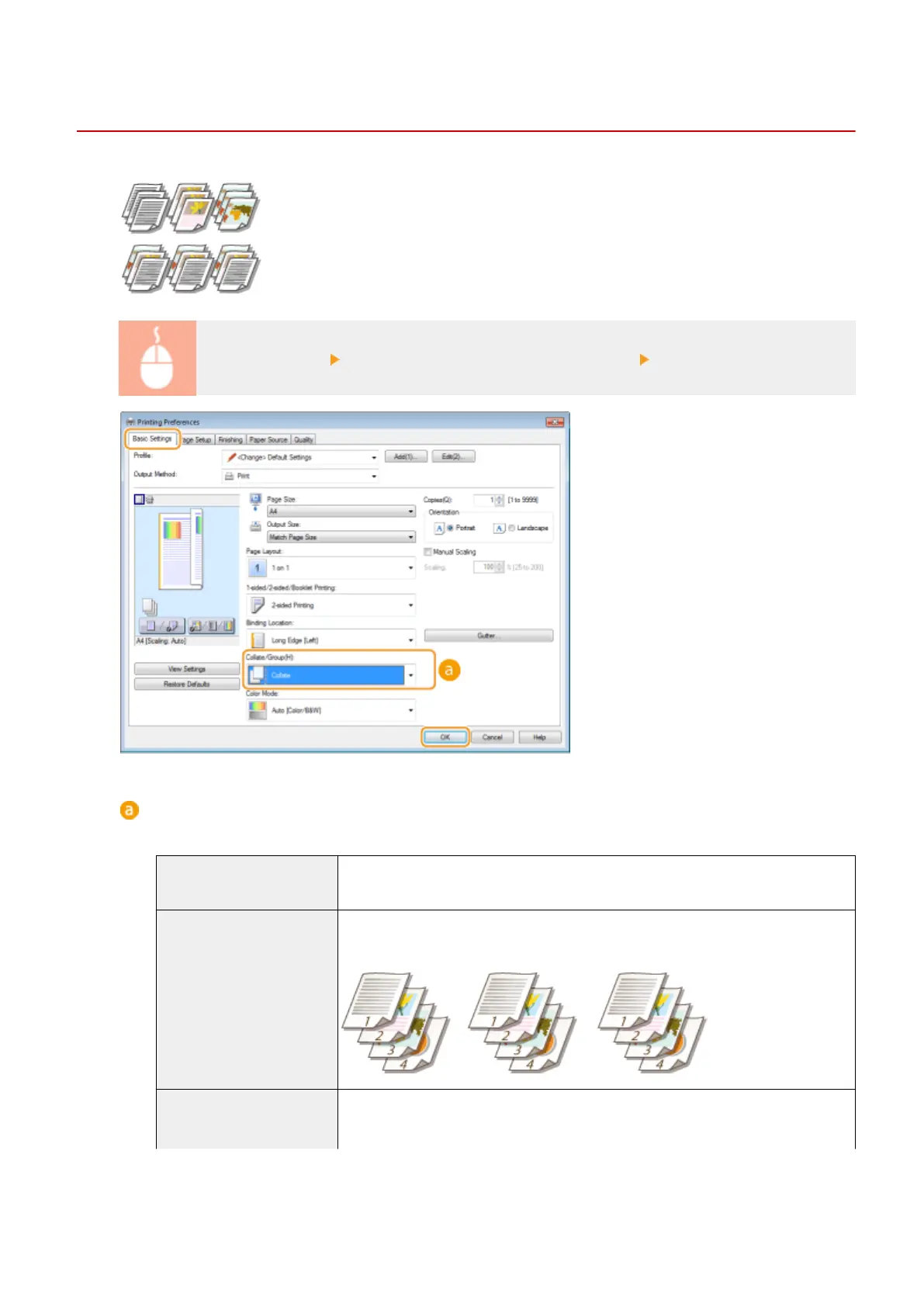 [Basic Settings] tab Select [Collate] or [Group] in [Collate/Group] [OK]
