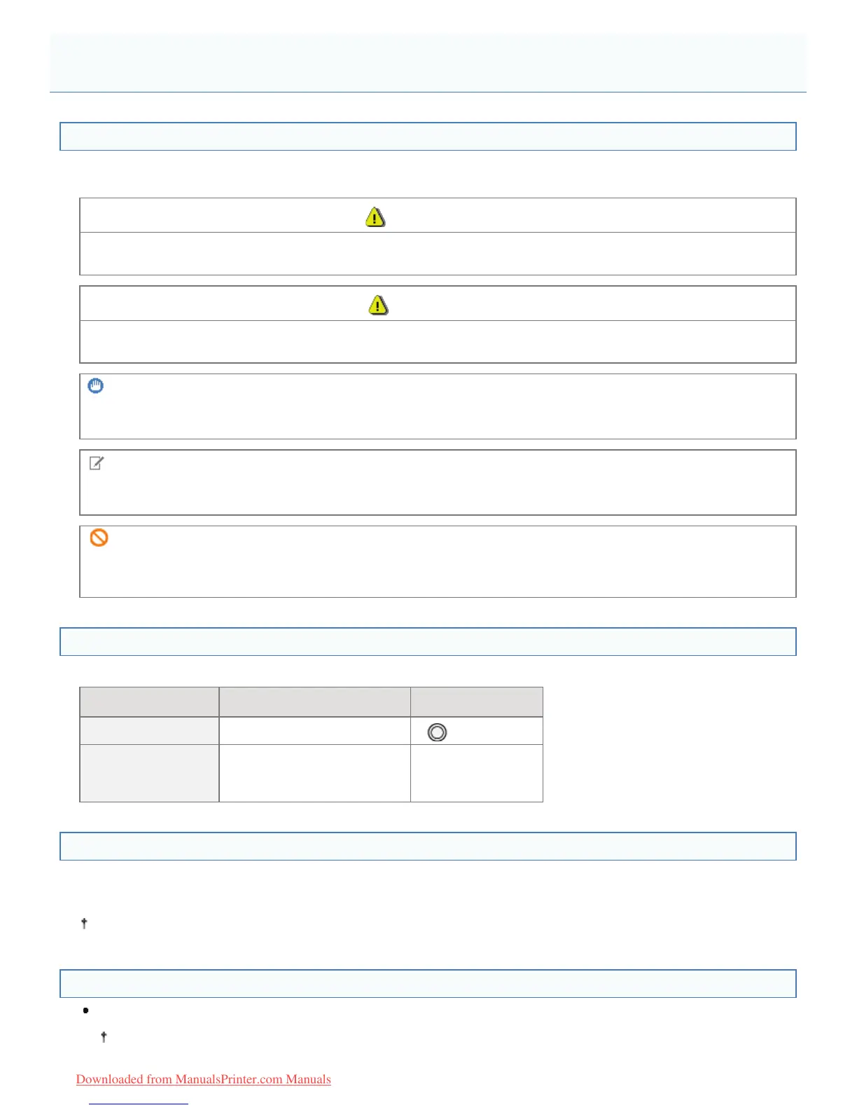 The following are descriptions of warnings and cautions used in the e-Manual to explain handling restrictions, precautions,