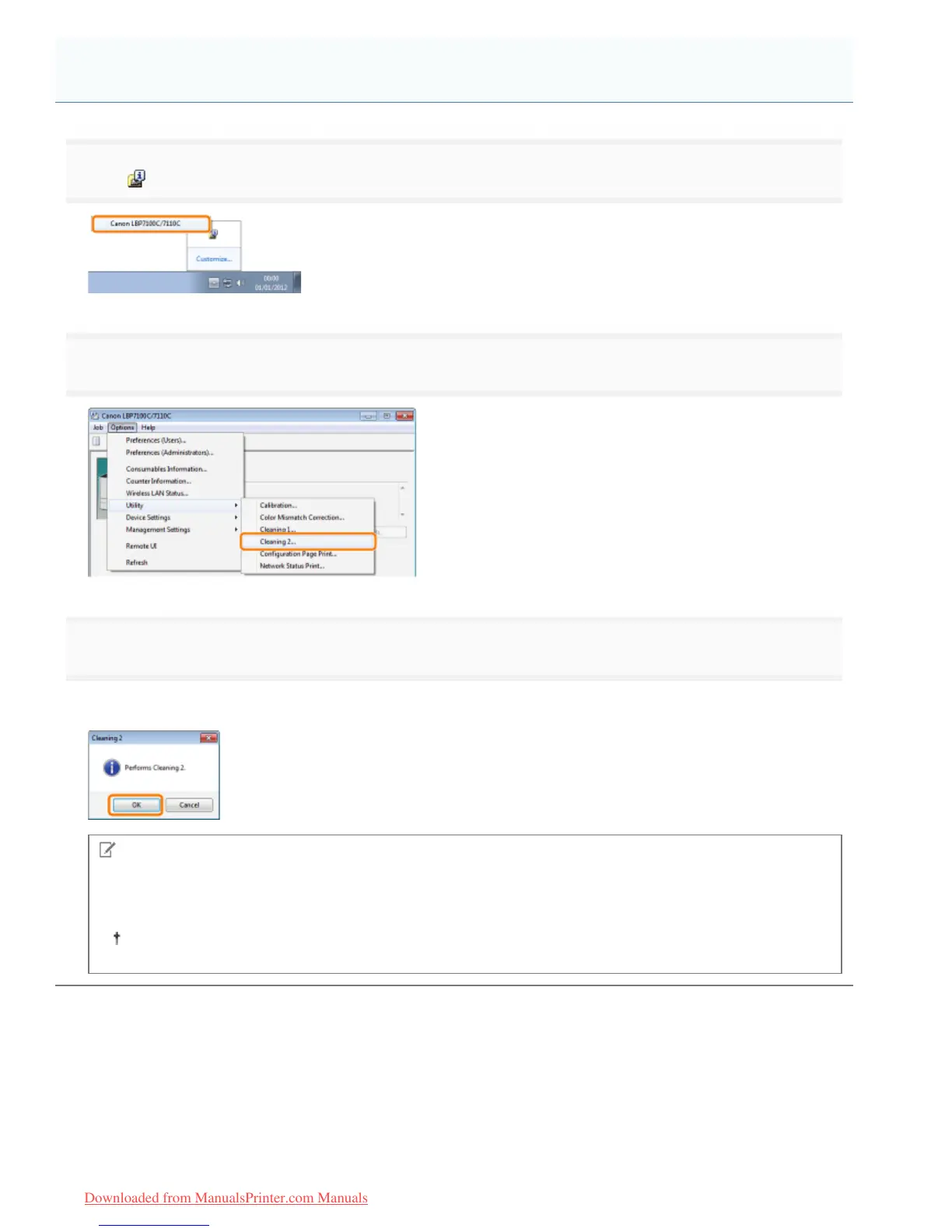 ĺ The message <Cleaning> appears in the Printer Status Window, and the printer starts cleaning the transfer belt.