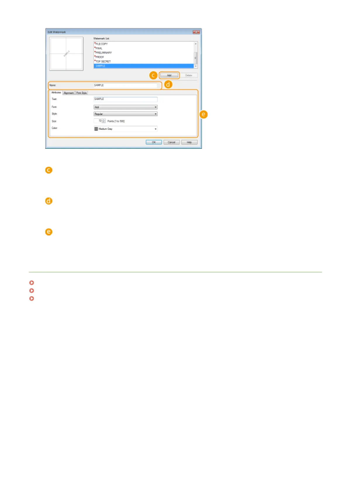 Click each tab to specify the text, color, or print position of the watermark. For more information, click [Help]