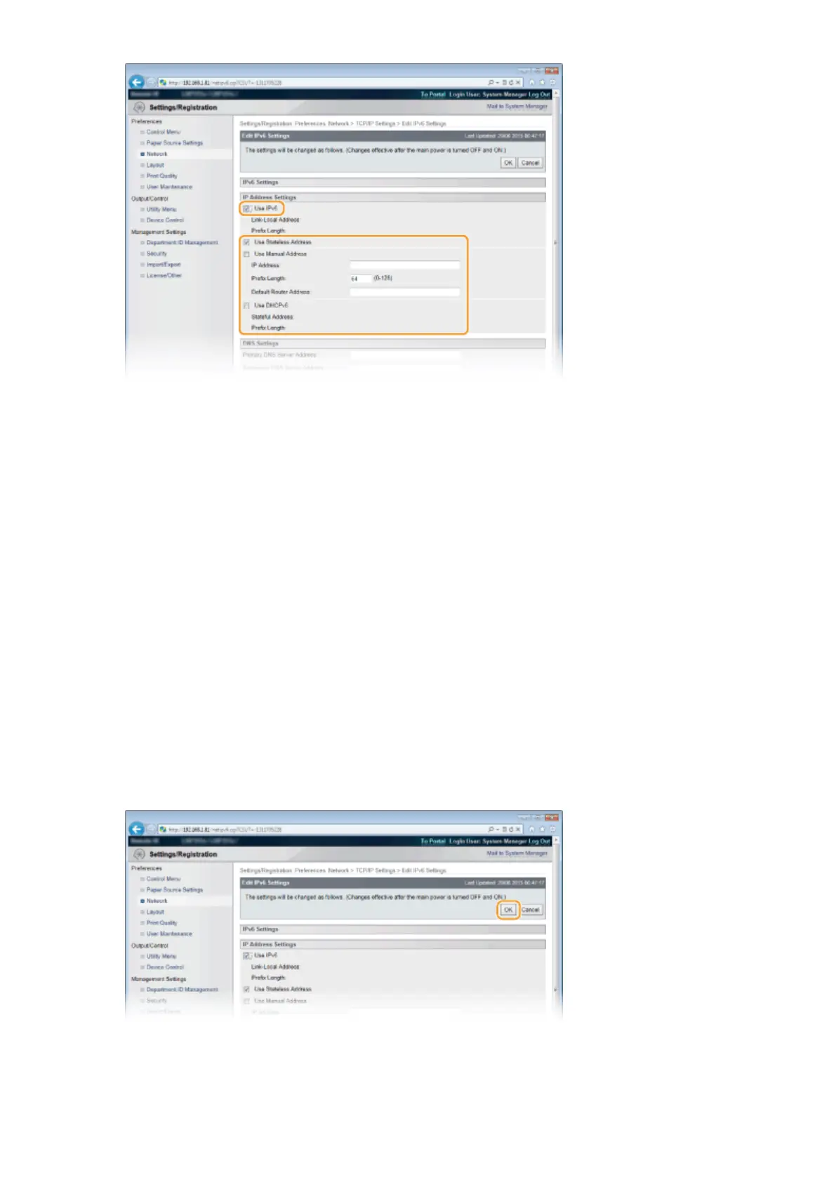 Select the check box to enable IPv6 on the machine. When not using IPv6, clear the check box.