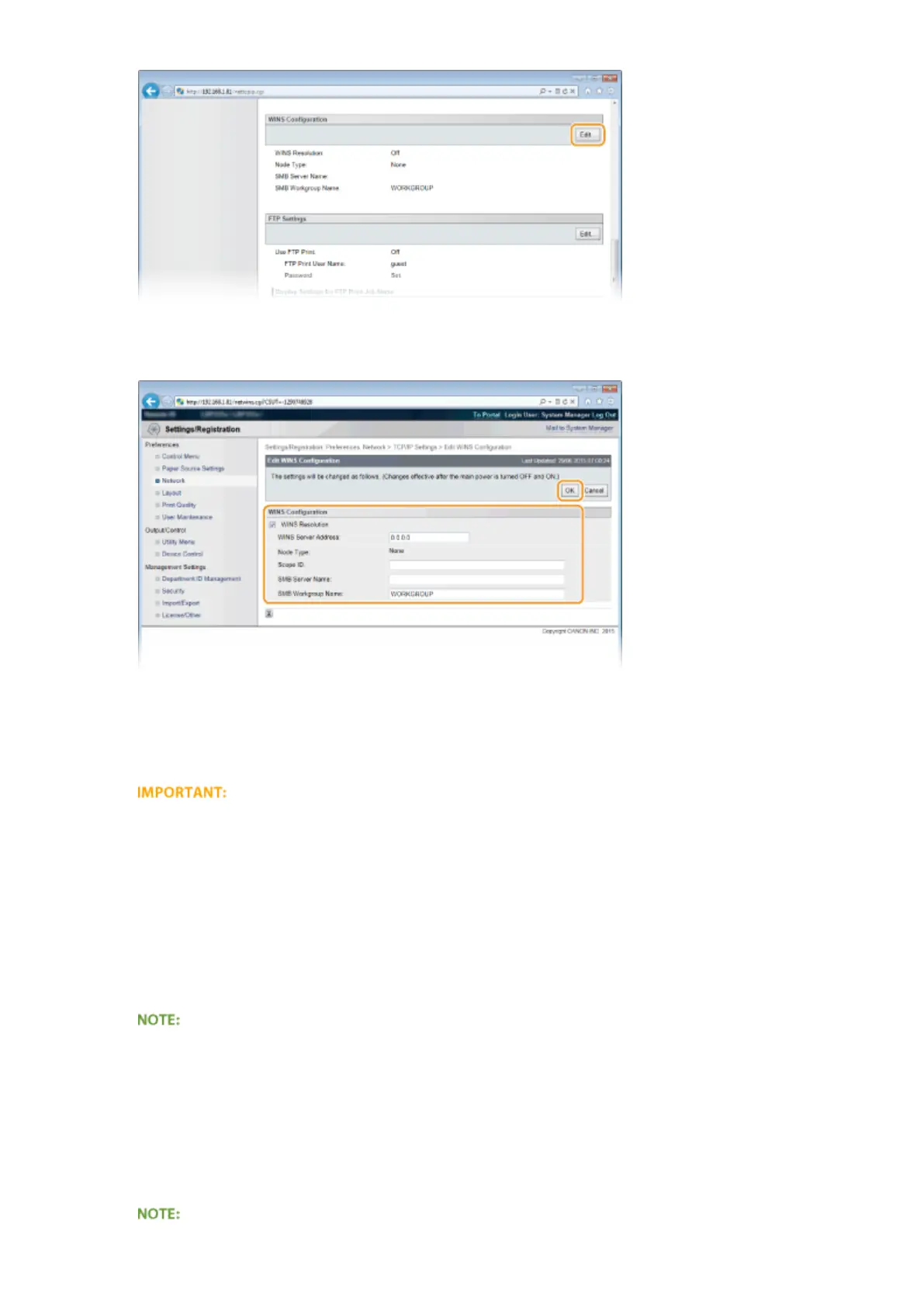 ● If the IP address of the WINS server is obtained from a DHCP server, the obtained IP address overrides the