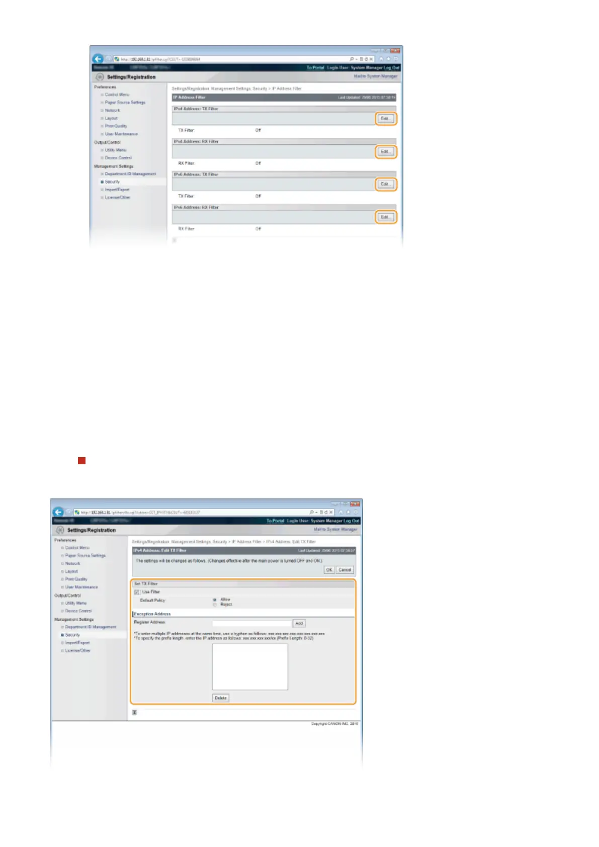 Select the default policy to allow or reject the communication of other devices with the machine, and then specify IP