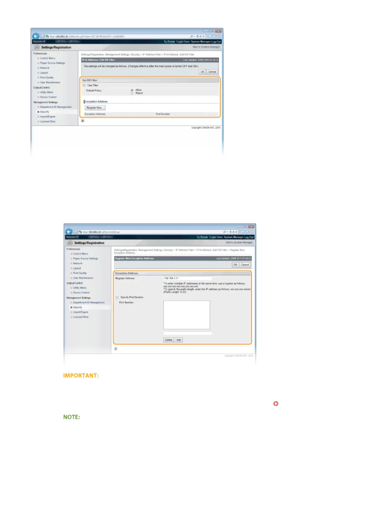 ● Enter the IP address (or the range of IP addresses) in [Register Address].