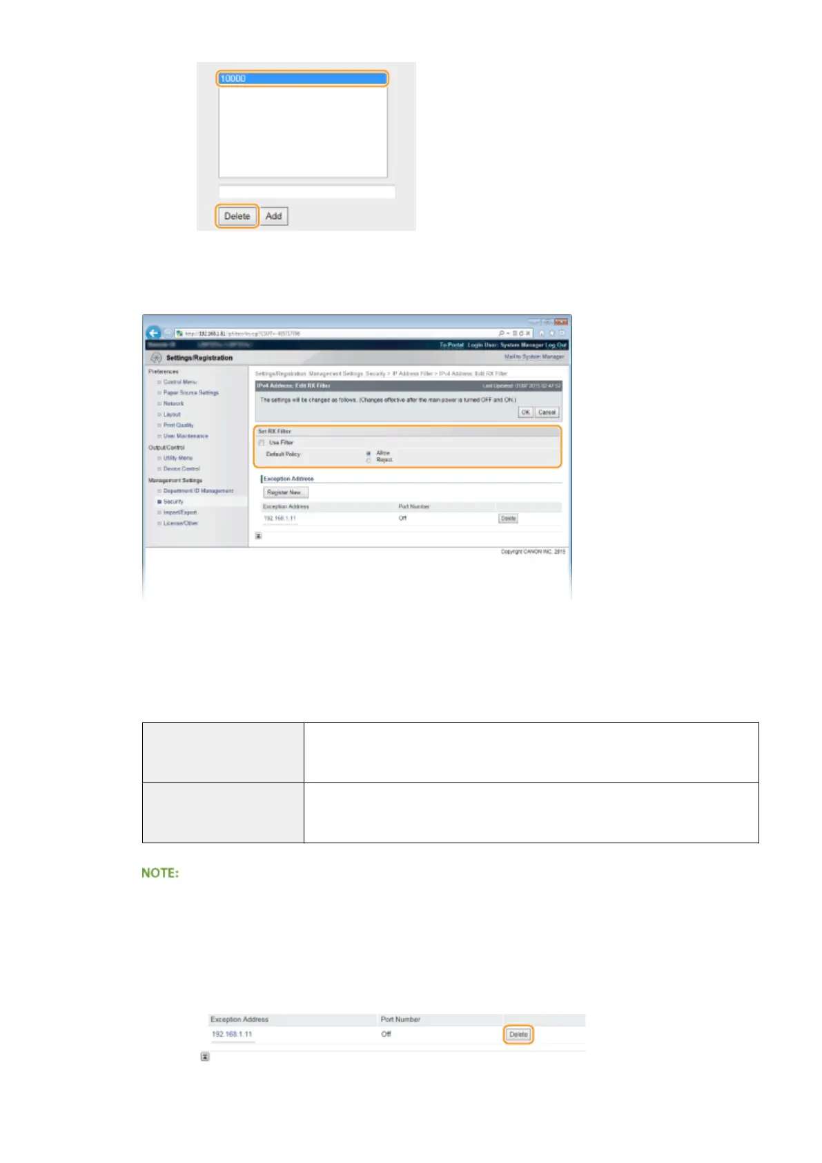 devices whose IP addresses are entered in [Exception Addresses]. Communications