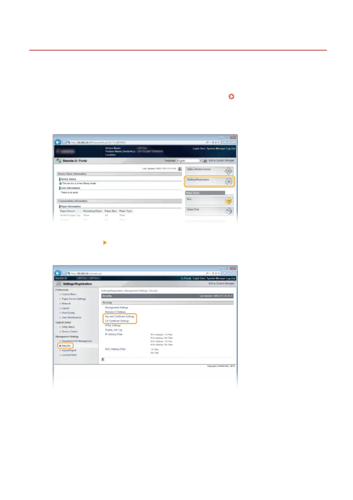● Click [Key and Certicate Settings] to verify a key pair, or [CA Certicate Settings] to verify a CA certicate.