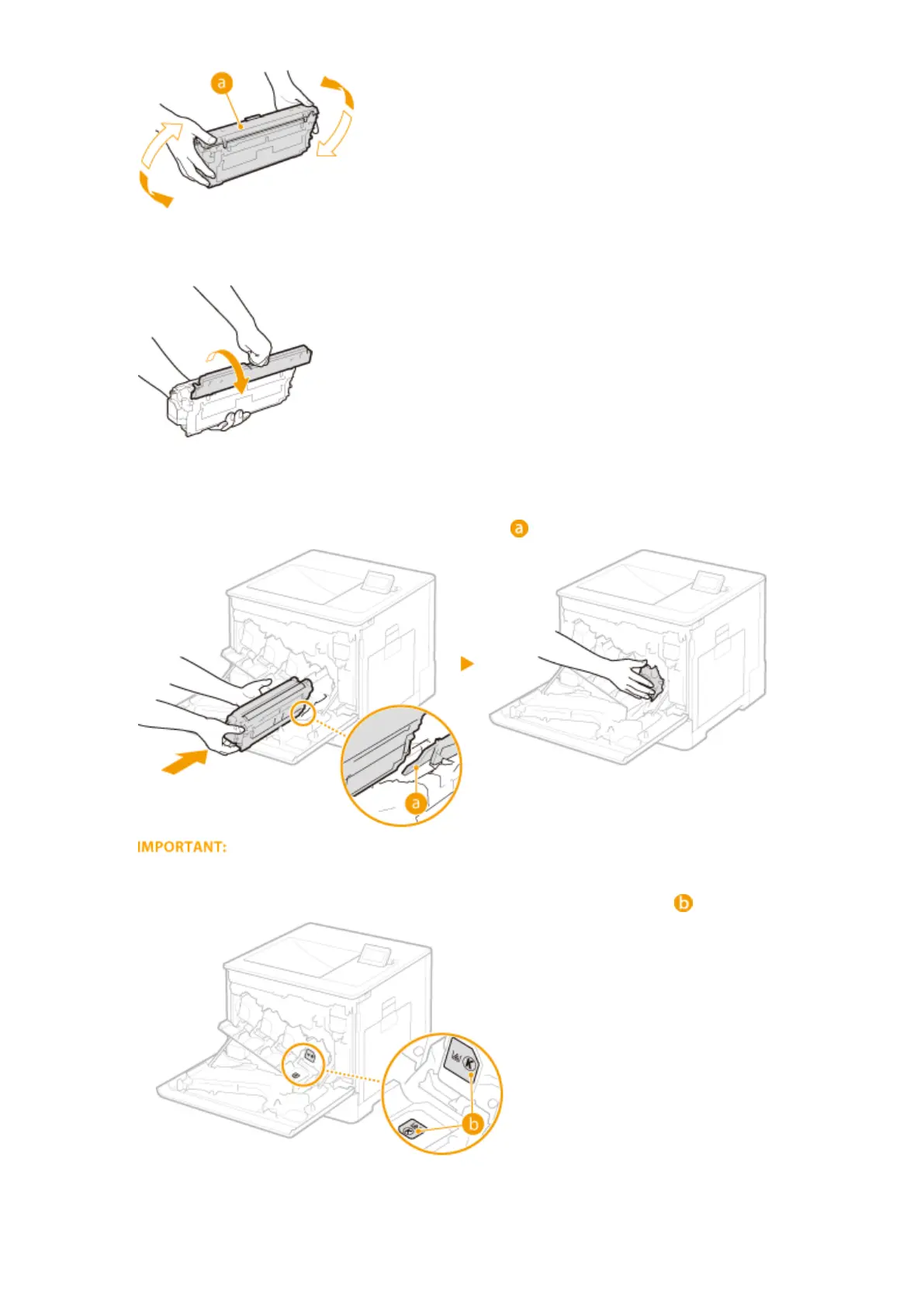Place the toner cartridge into the slot marked with the appropriate color label ( ).