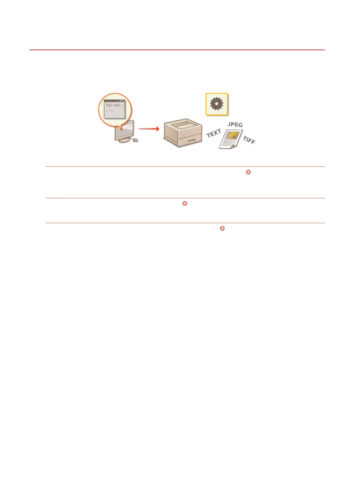 You can print a document sent to the machine via FTP. Printing via FTP Client (FTP Print)(P. 651)