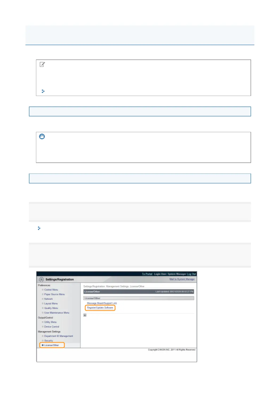 From the top page of the Remote UI, click [Settings/Registration] → [License/Other] →