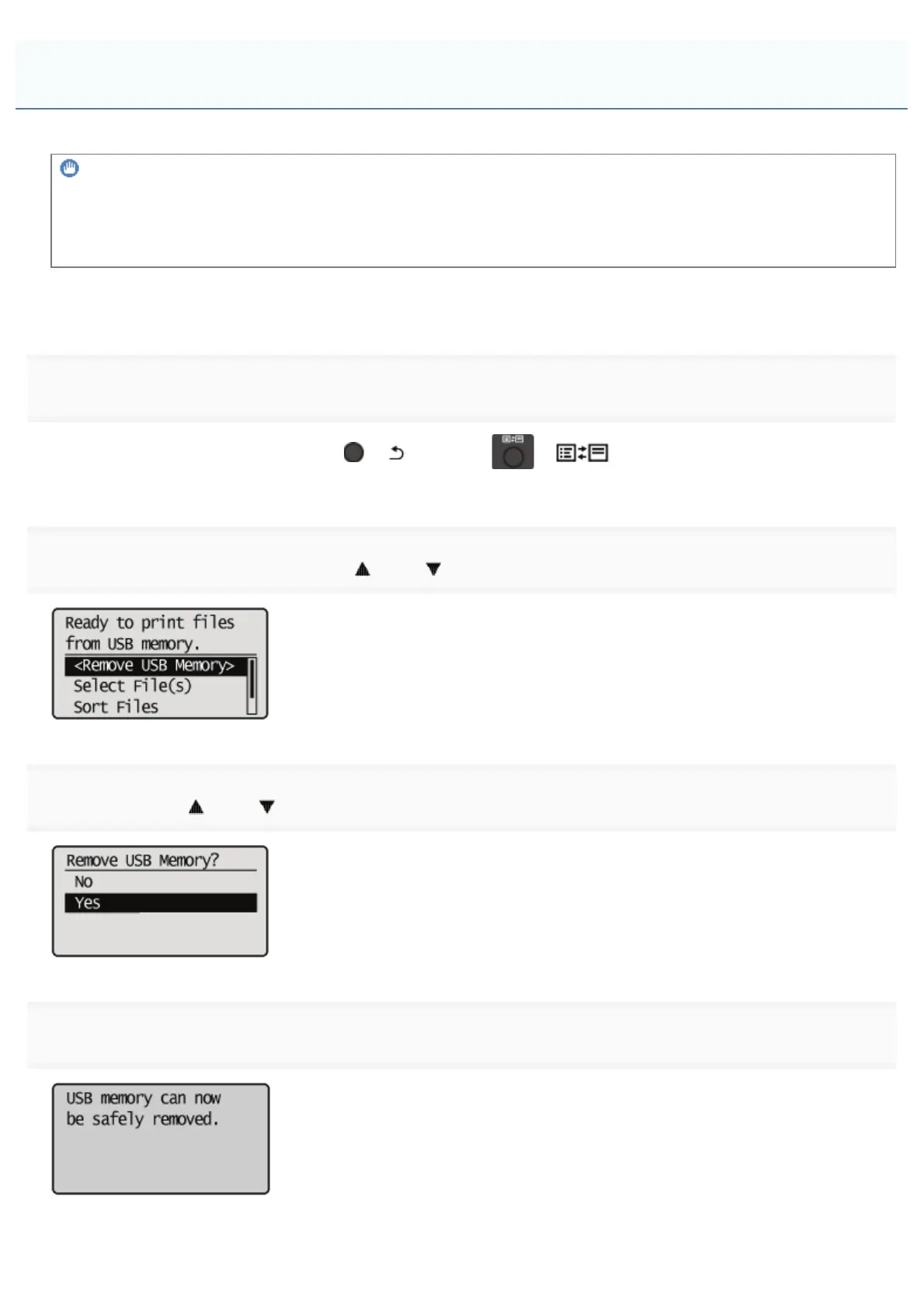 The following procedure is explained when the "USB Direct Print Mode Screen" is displayed. Remove the USB memory