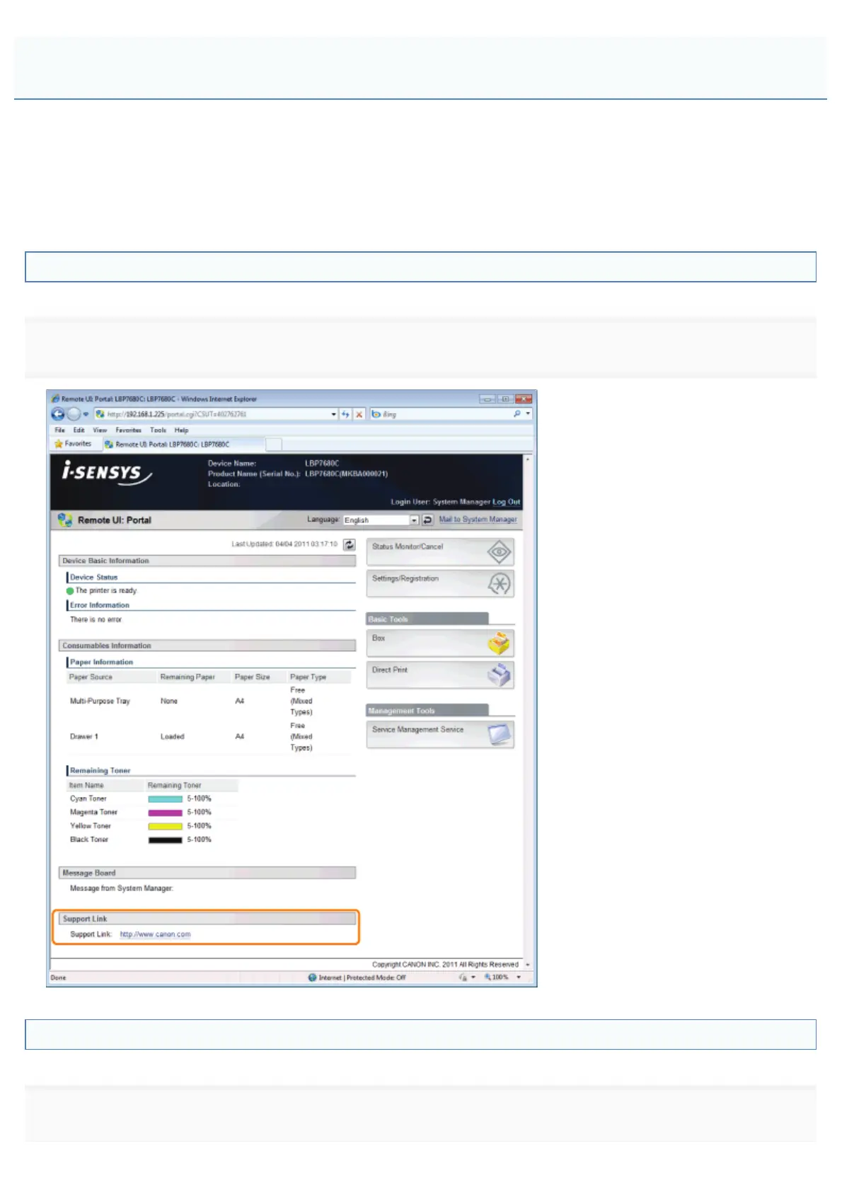 set links to information about printer support in the portal page support link, and make it accessible from the Remote UI