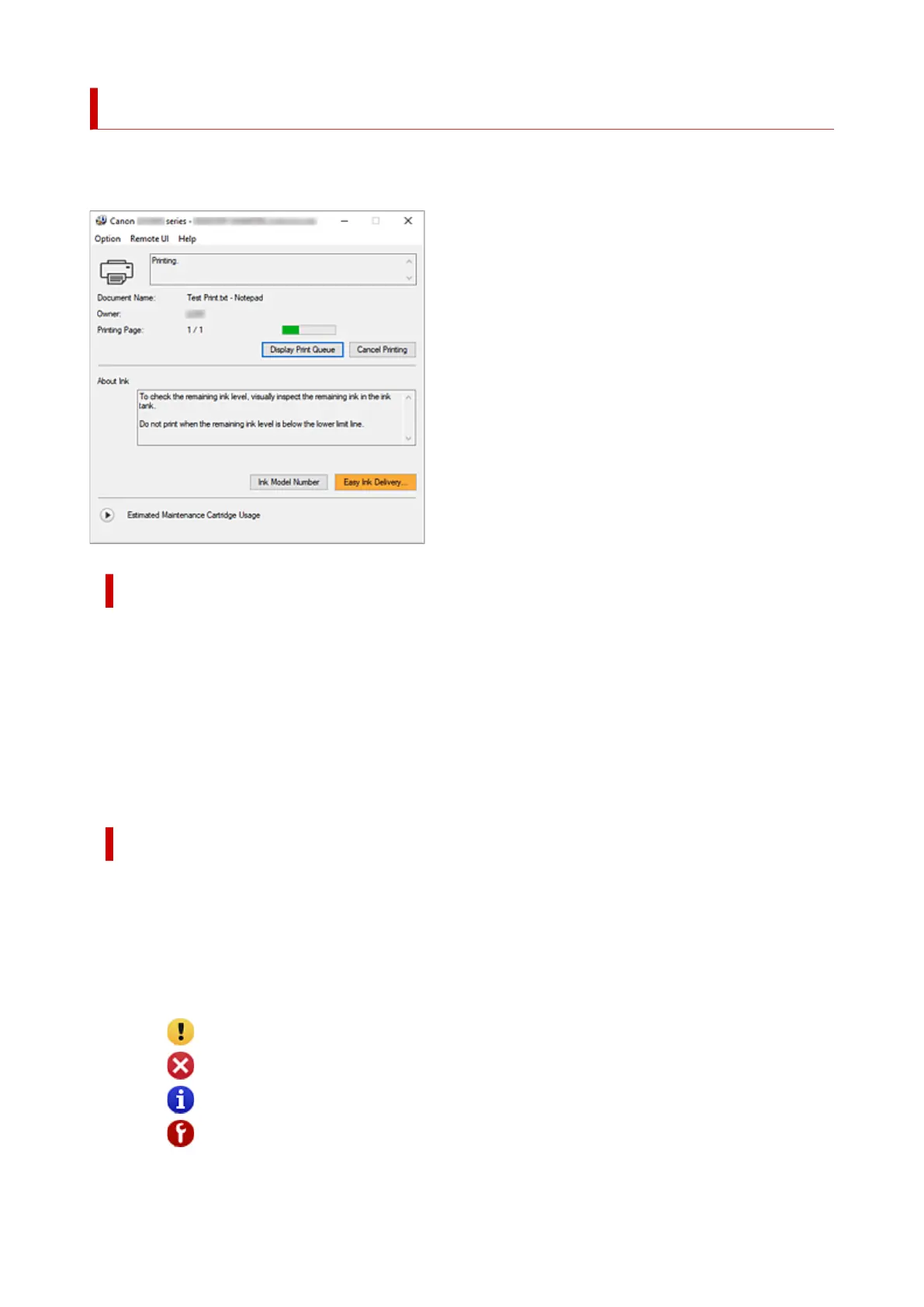 The Canon IJ Status Monitor displays icons and messages related to printer status and ink.