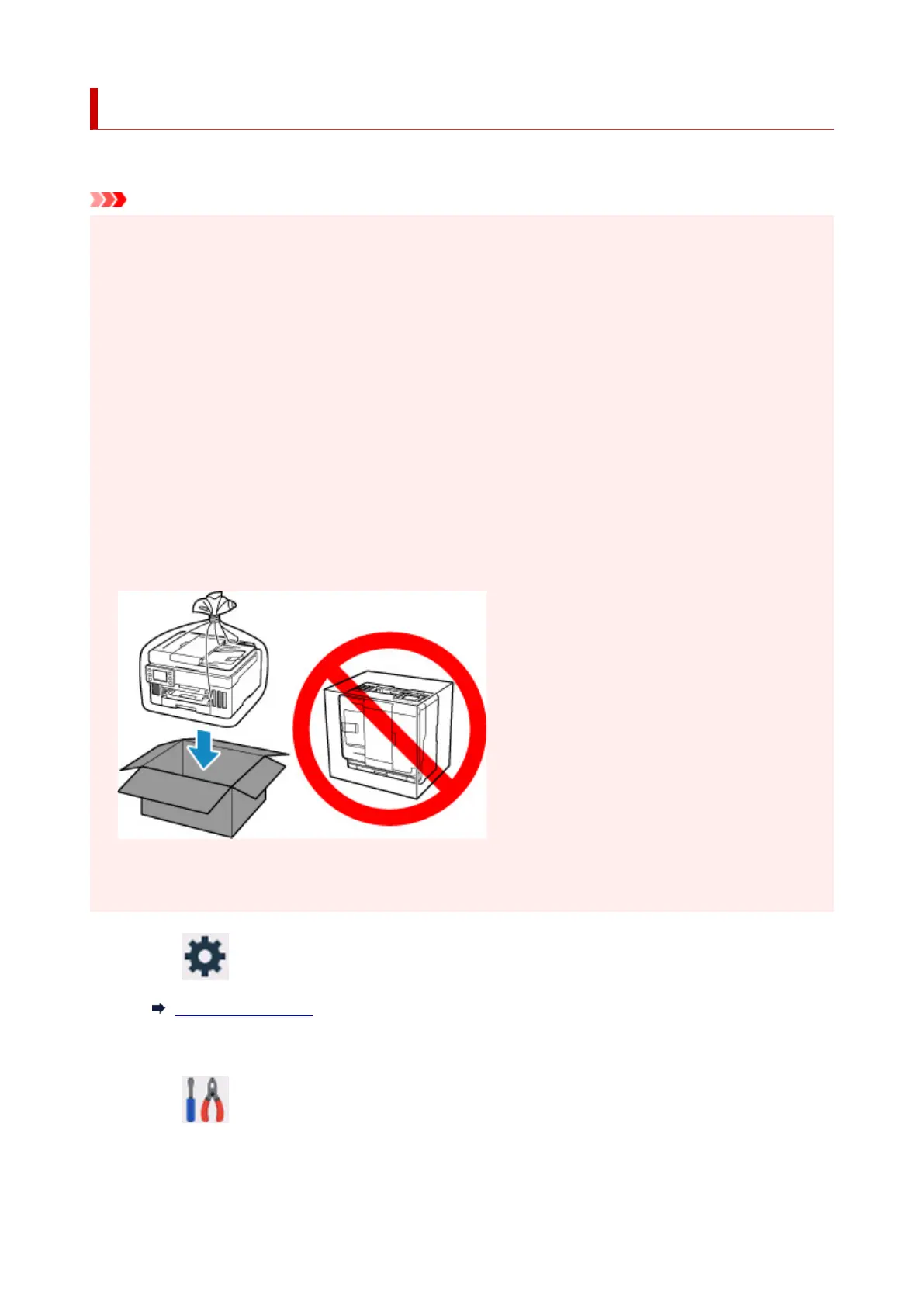 • When transporting the printer, pack the printer in a plastic bag so that ink does not leak.