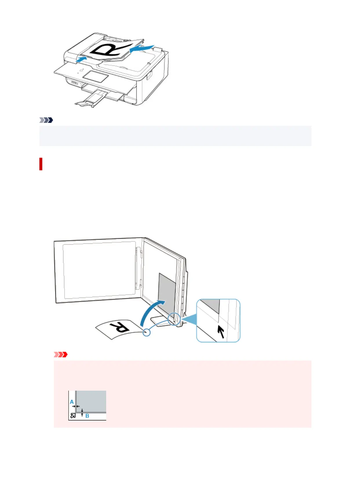 • Portions placed over (A) (0.094 inch (2.4 mm) from the left edge of the platen) or (B) (0.106 inch