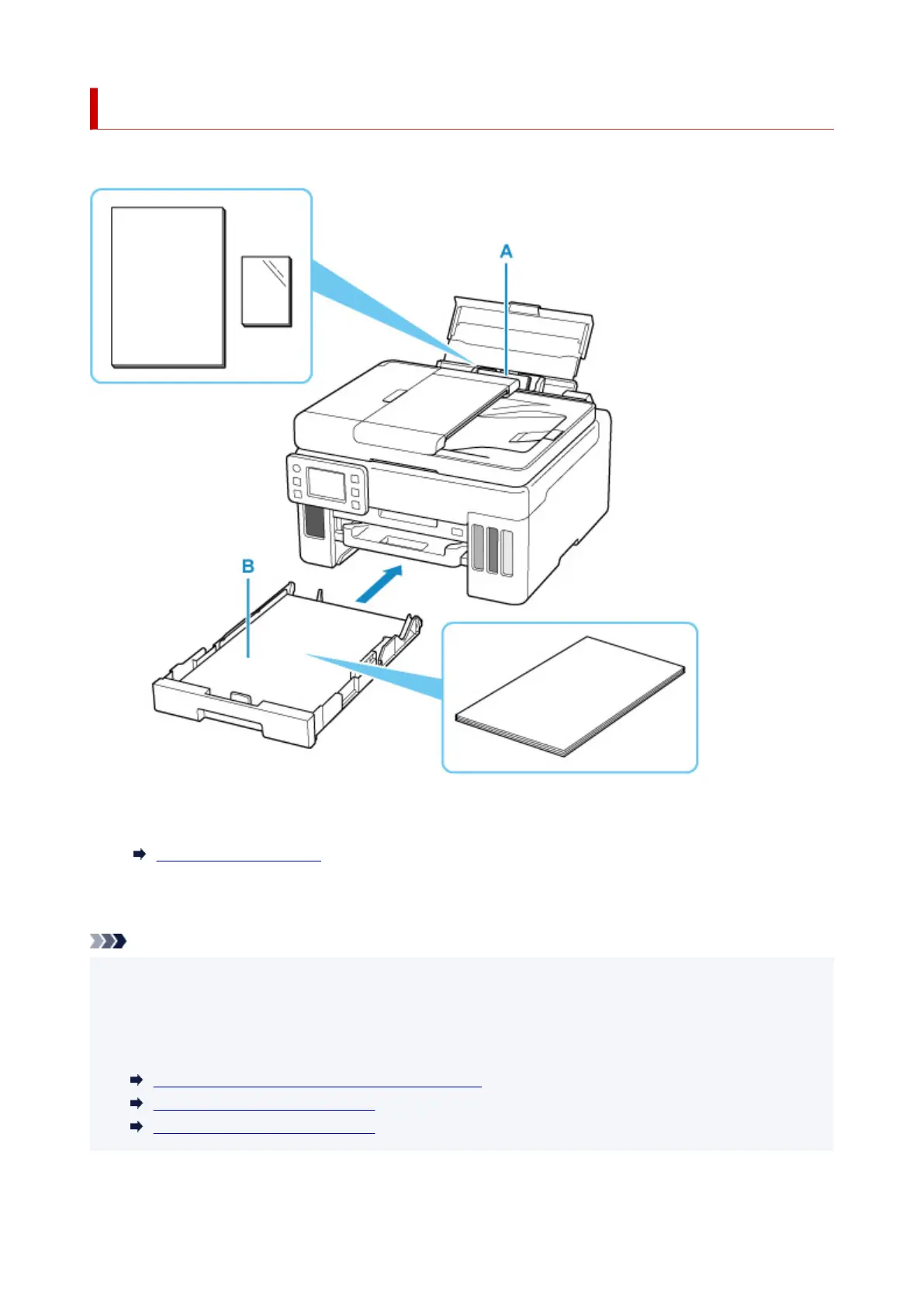 The paper can be loaded in the two paper sources: rear tray (A), cassette (B).