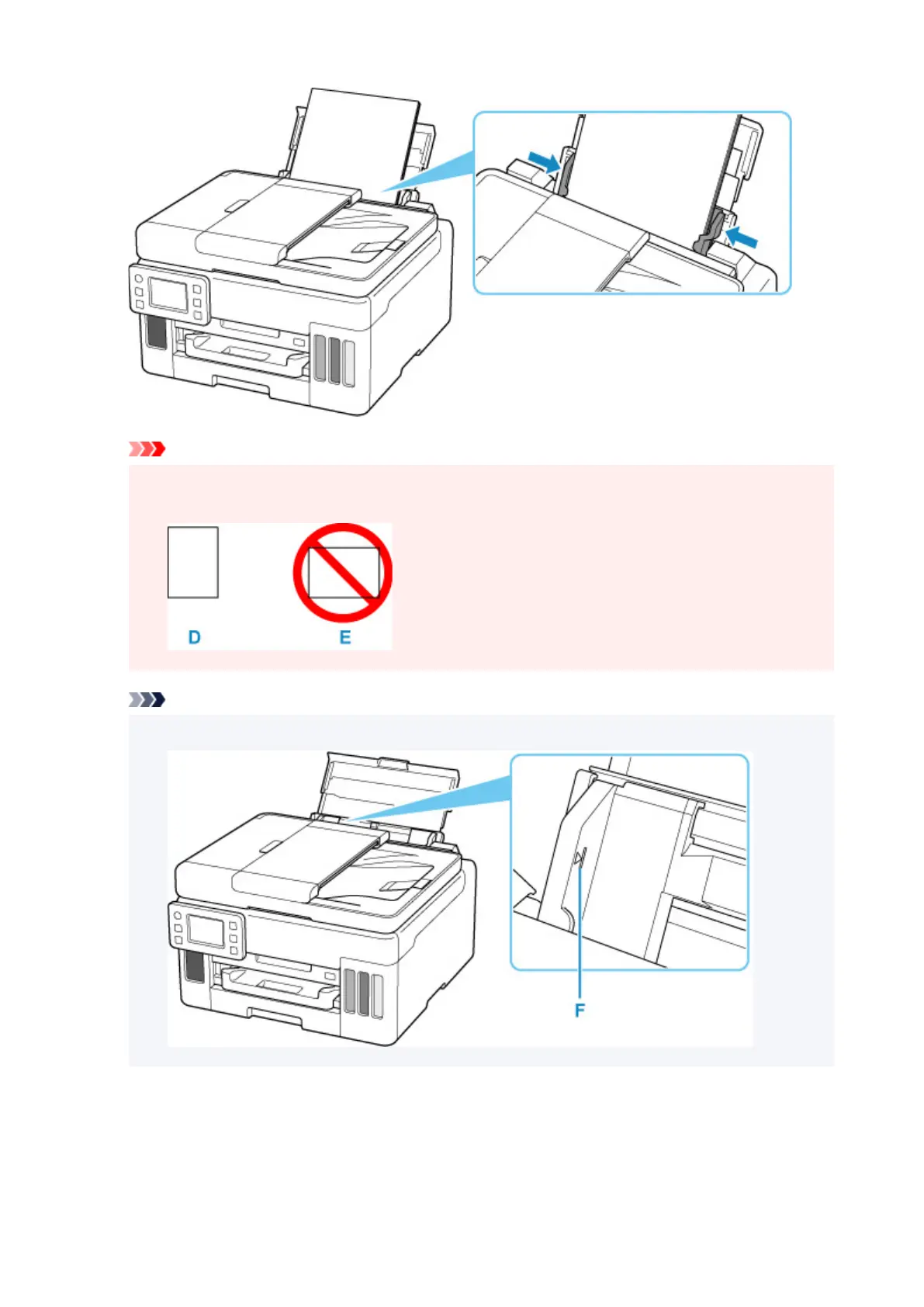 Always load paper in portrait orientation (D). Loading paper in landscape orientation (E) can