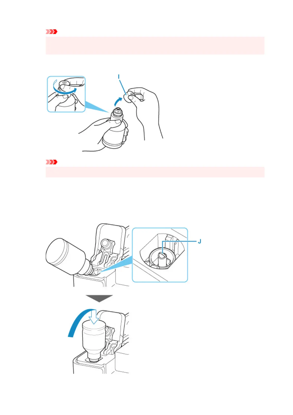 5. Hold the ink bottle upright and gently twist the bottle cap (I) to remove.