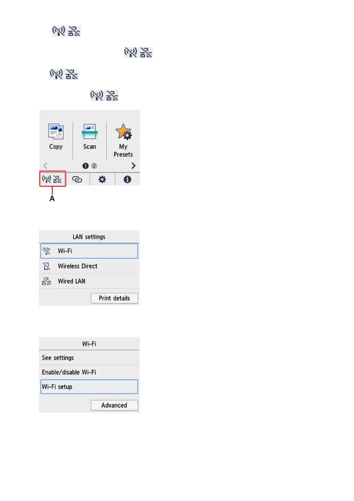Canon MAXIFY GX7070 - Tap Wi-Fi Icon; Select Wi-Fi Option; Start Wi-Fi Setup
