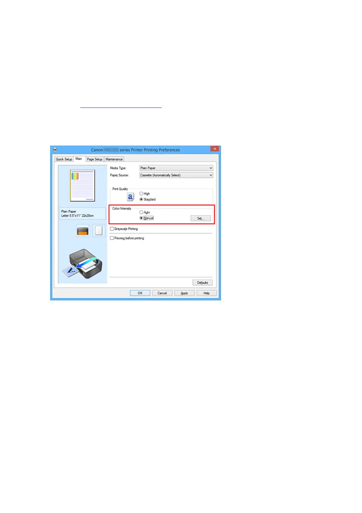 On the Main tab, select Manual for Color/Intensity, and click Set....