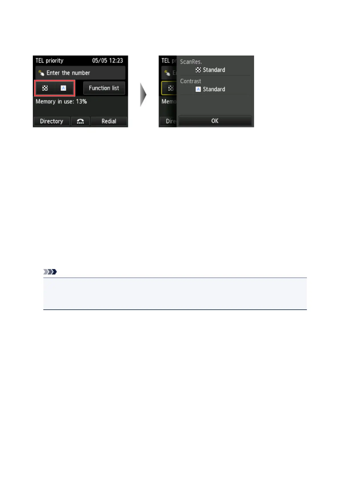 You can specify the settings of the scan contrast and the scan resolution on the Fax standby screen.
