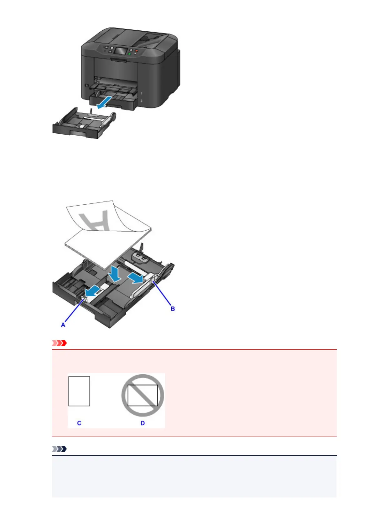 Always load paper in the portrait orientation (C). Loading paper in the landscape orientation (D)