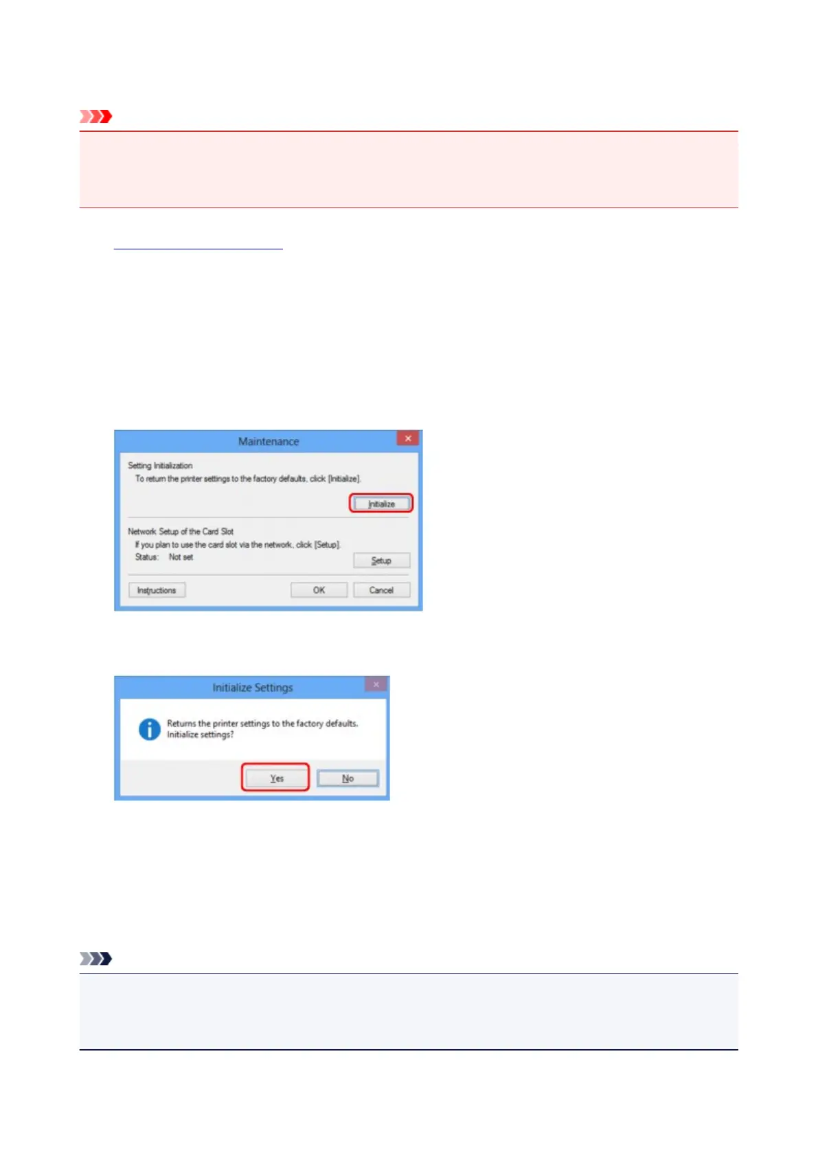 • Note that initialization erases all network settings on the machine, printing or scanning operation from a