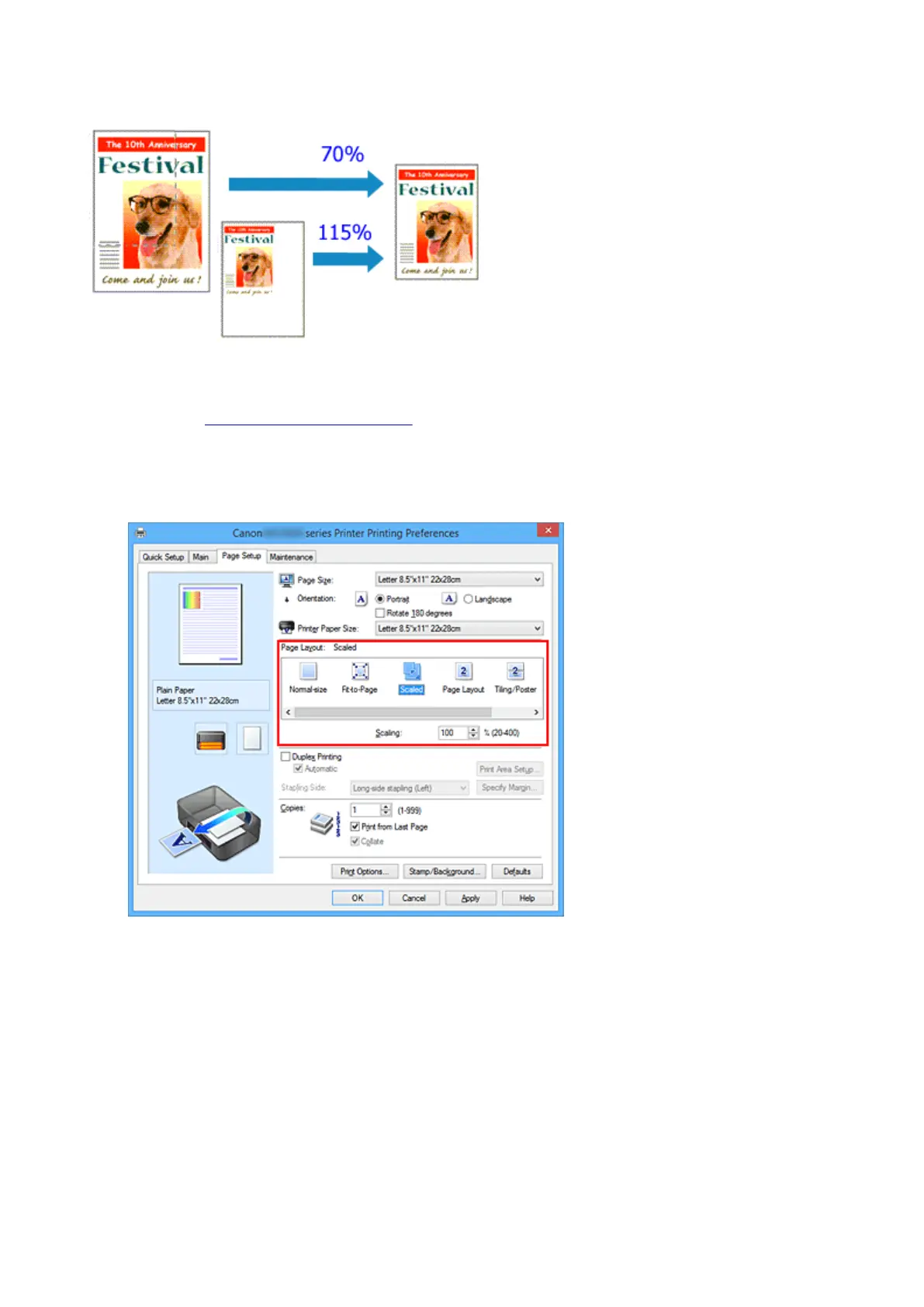 When the printer paper size is smaller than the Page Size, the page image will be reduced. When