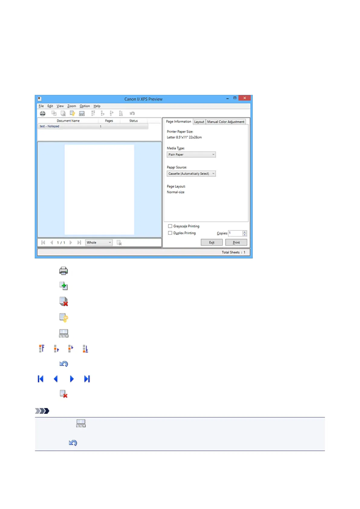 In the Canon IJ XPS preview window, you can edit the print document or retrieve the document print history