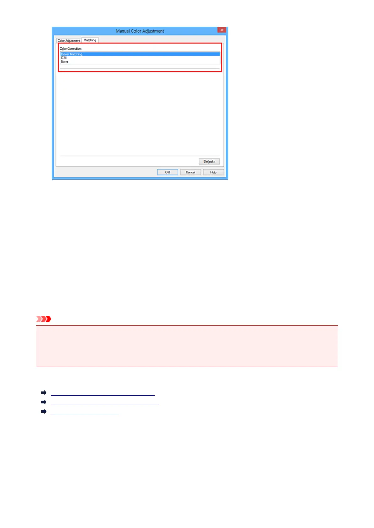 The printer driver does not perform color correction. Select this value when you are specifying an