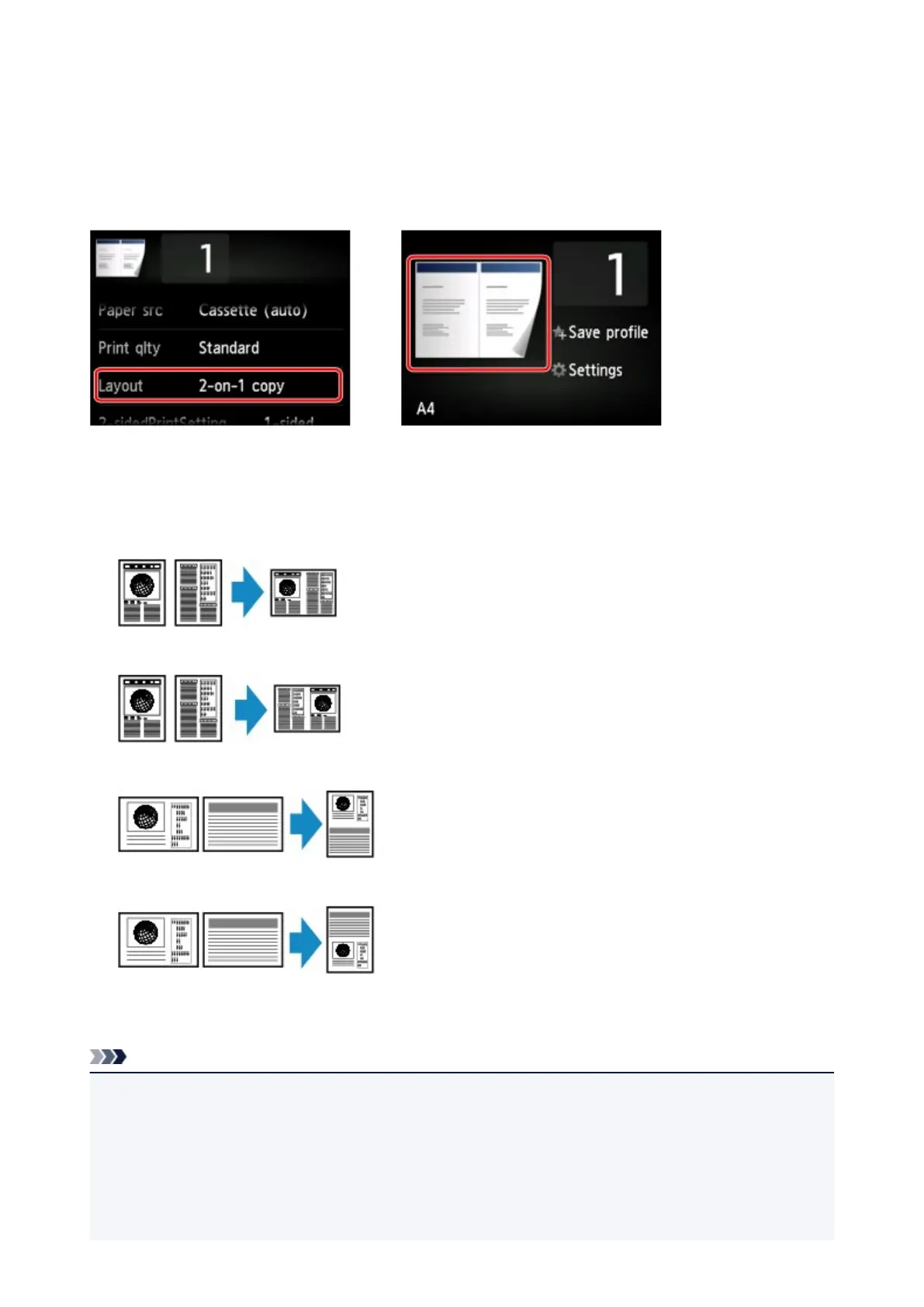 When you select 2-on-1 copy for Layout in Copy, you can copy two original pages onto a single sheet of