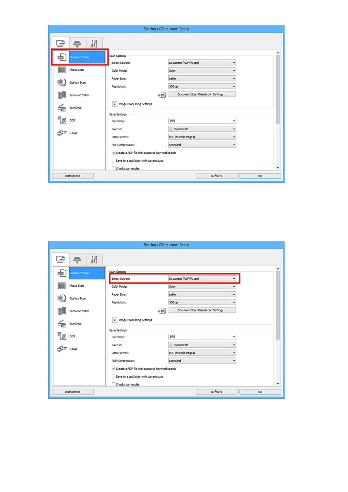 Click Document Scan Orientation Settings... to specify the orientation of the documents to be