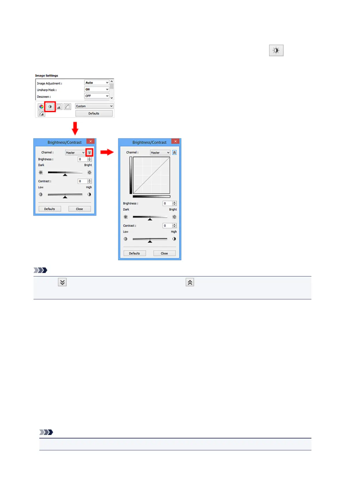(Brightness/Contrast) in ScanGear (scanner driver)'s Advanced Mode tab.