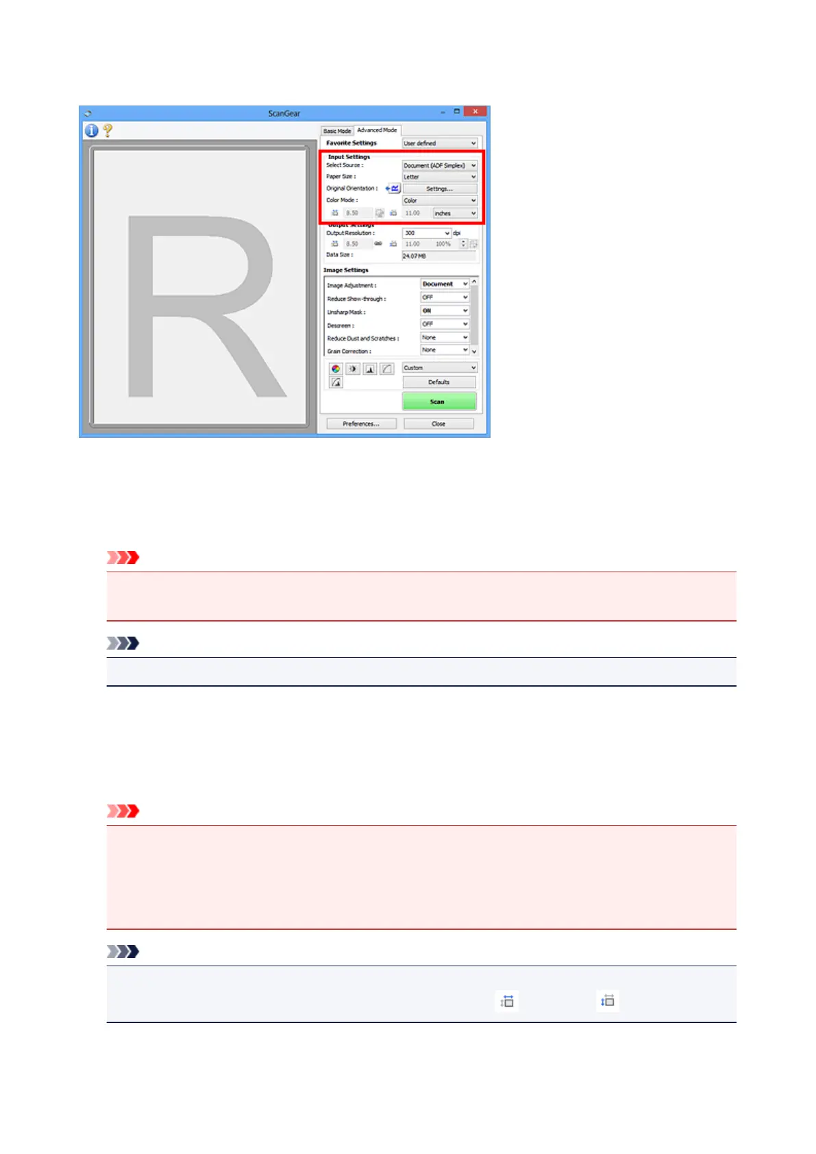 Select the size of the document to be scanned. This setting is available in whole image view only.