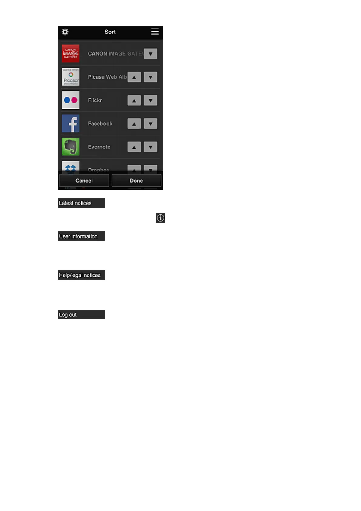The description of the Canon Inkjet Cloud Printing Center screen and various reminders are