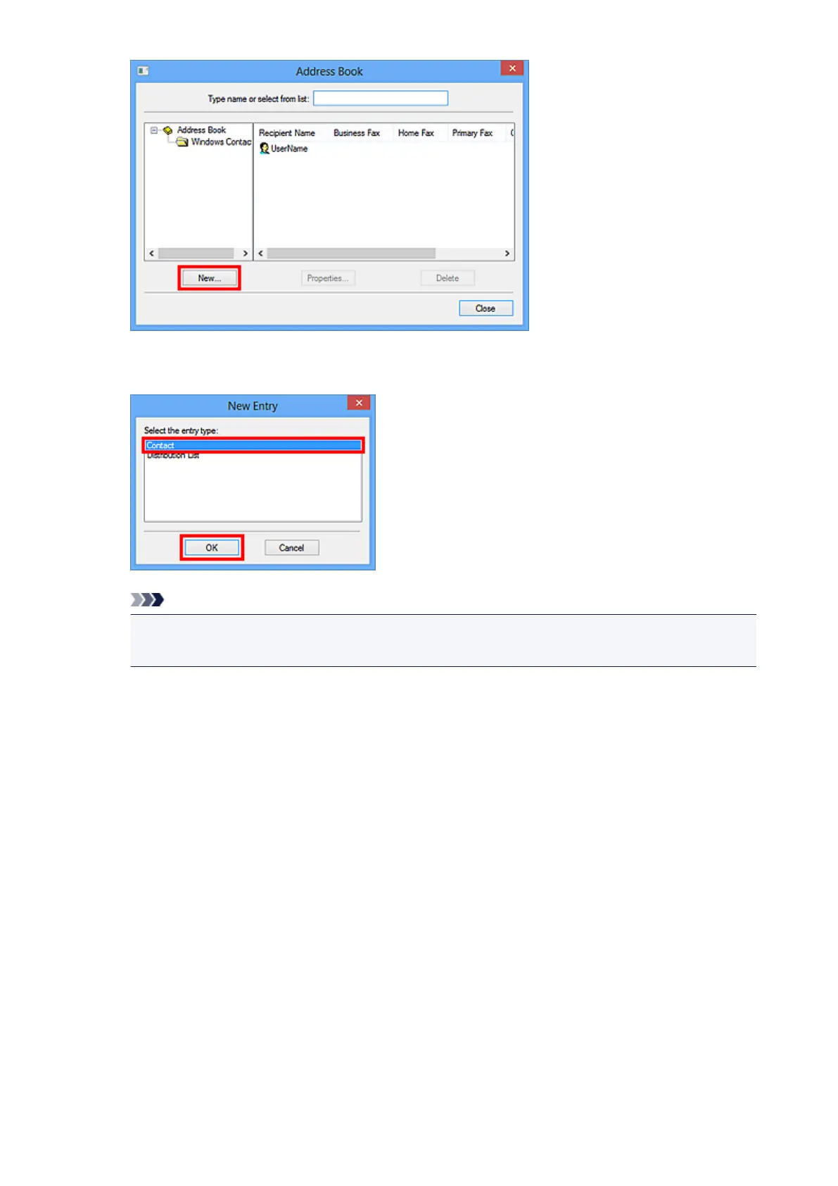 • For faxing, you can only specify the Contact (one recipient). You cannot specify a Distribution