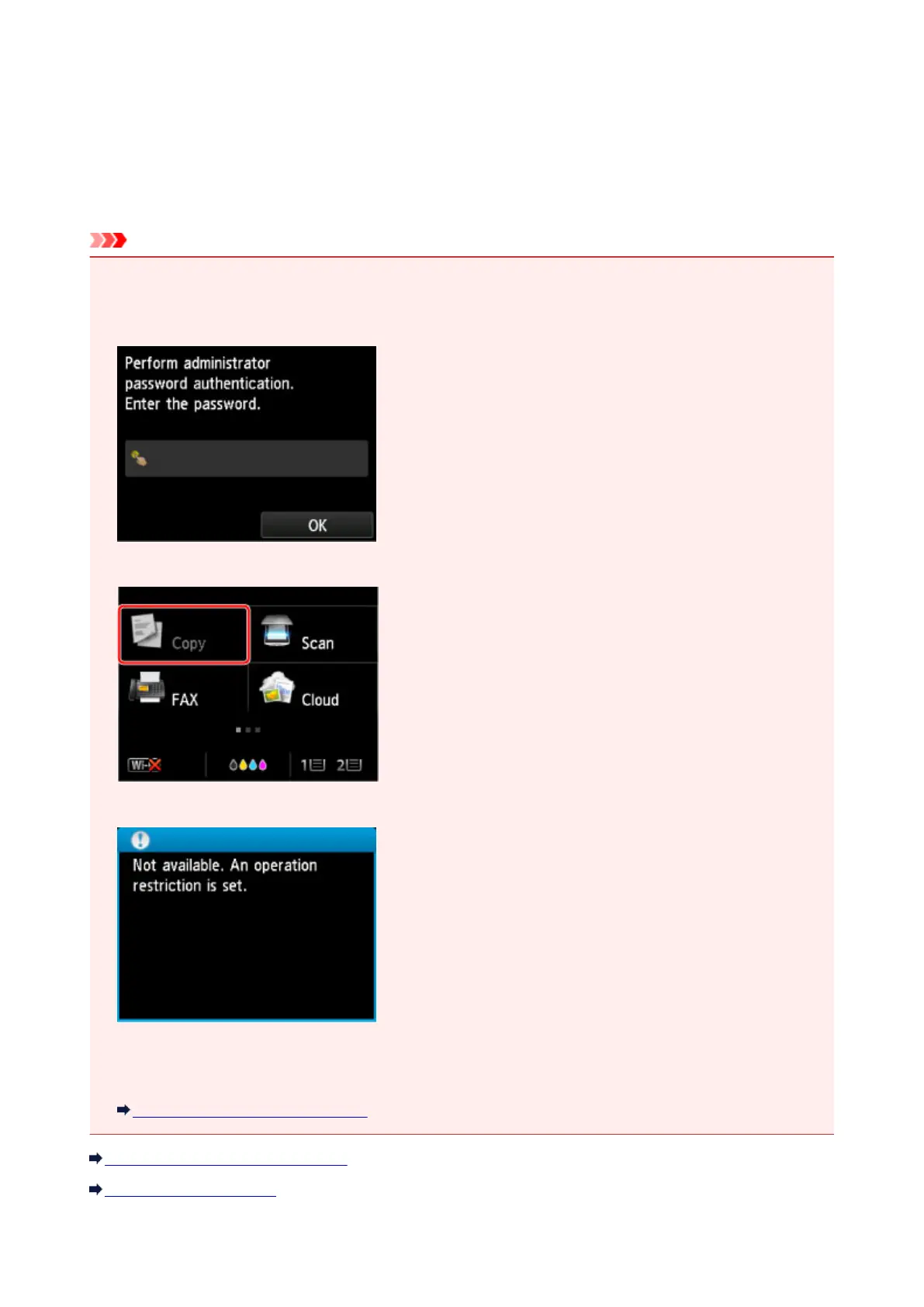 • When the administrator password is specified or some operations are restricted, the screens below are