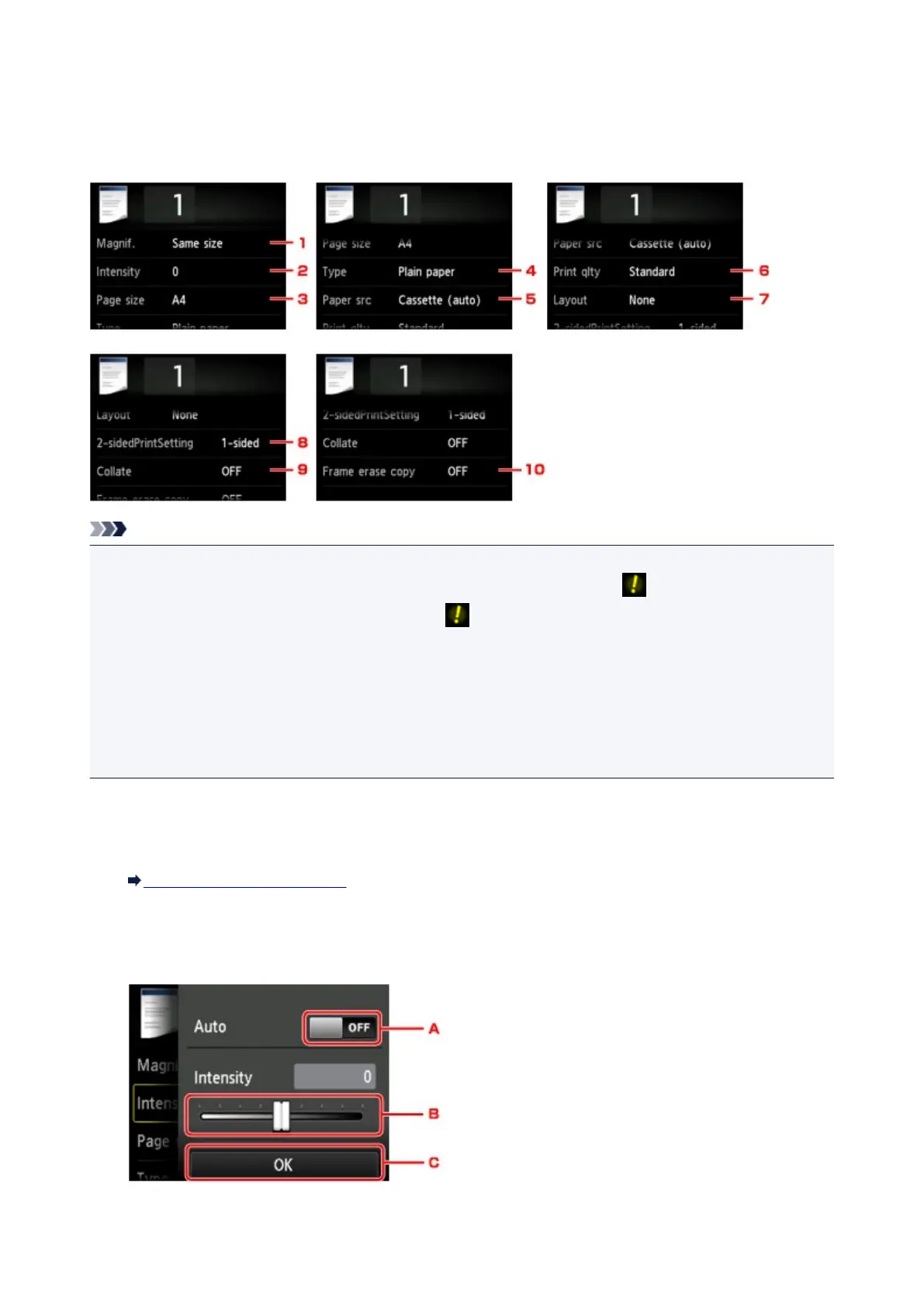 • When copying starts in the copy menu that is not available with the specified setting, The specified