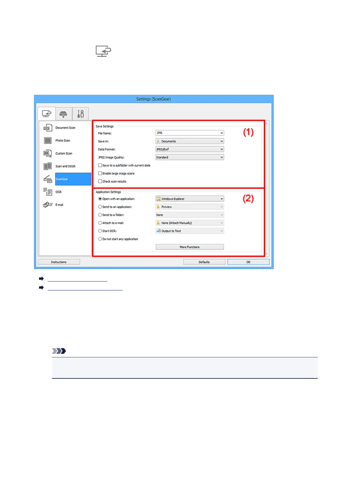 Click ScanGear on the (Scanning from a Computer) tab to display the Settings (ScanGear) dialog